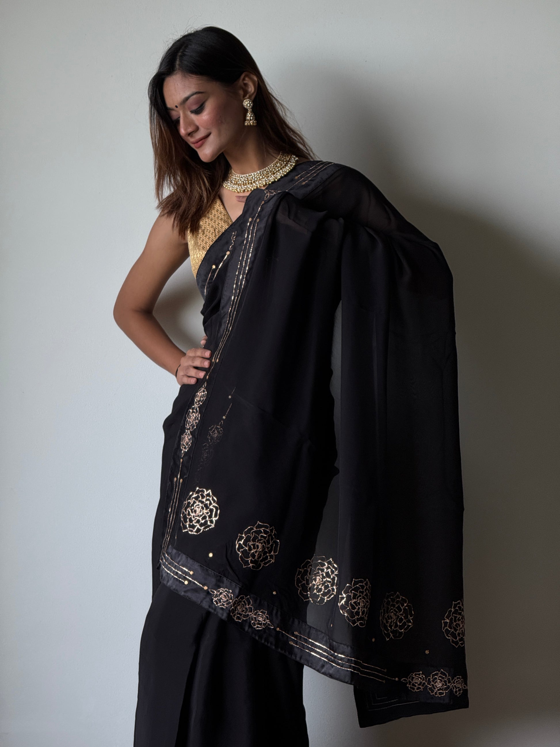 Command the room in a saree that honours tradition and keeps pace with your ambition. The fluid drape sits neatly through pleats and glides at the pallu, delivering day-long ease without compromising on presence.